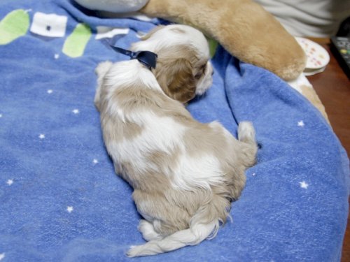この度はとっても元気な子をありがとうございました。 見学の際は駅まで迎えにきていただき、説明もとても丁寧で安心しました。 空輸で送っていただき、ありがとうございました。 迎えてから一週間が経ち、家にも慣れて、へそ天で寝ています。 トイレトレーニングも、来た時から8割できていて、今ではほとんど失敗しなくなりました。 可愛く元気で、毎日元気に飛び跳ねています。(奈良県 女性)