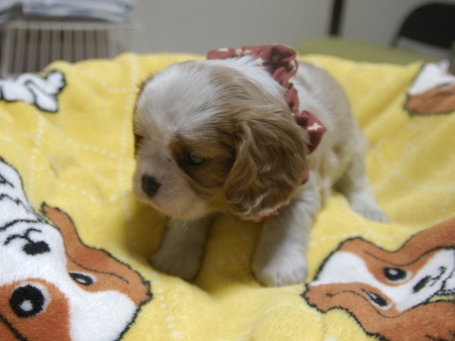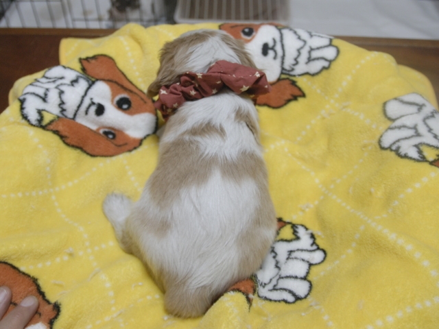 コメント | お父さんはJKCチャンピオンの家斉君、お母さんはチャンピオン直子スカーレットちゃんから生れたキュートな女の子です。(赤星リボンちゃん) 健康状態は、問題有りません。 すくすく育っています。 |