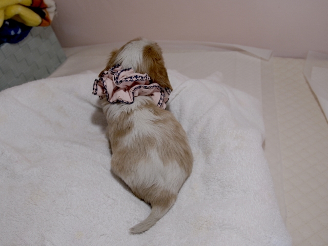 コメント | お父さんはJKCチャンピオンの家斉君、お母さんはチャンピオン直子エリカちゃんから生まれたキュートな女の子です。(桃リボンちゃん) 健康状態は、問題有りません。 すくすく育っています。 |